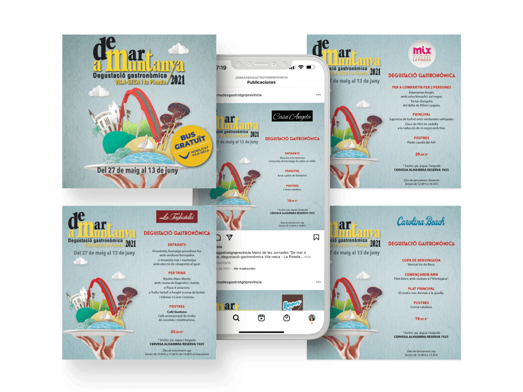 Desarrollo creativo de la campaña gráfica para las jornadas gastronómicas “De mar a muntanya”, incluyendo el diseño individual de los menús para cada restaurante participante y la creación de una landing page centralizada con todos los contenidos, optimizada para difusión en redes sociales y consulta digital.